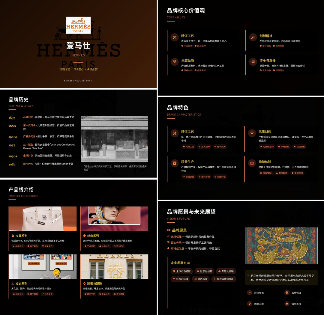 使用高大上的配色和奢侈品风格,生成一个关于爱马仕品牌介绍的PPT