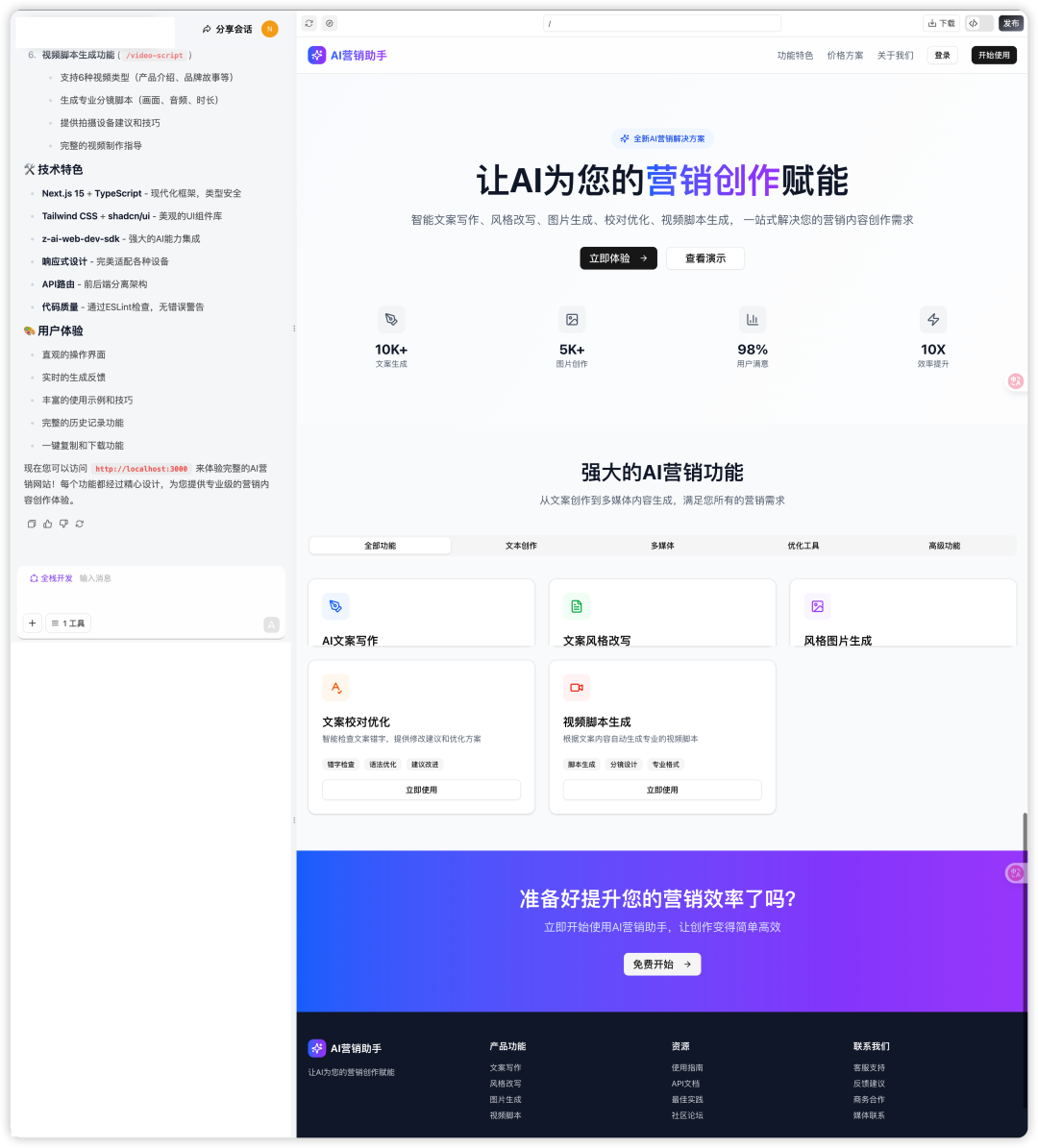 随后,小编又顺手做了一个AI营销的网站,几分钟之后,我感觉明天可以汇报老板,公司可以再开设一条AI营销的业务线了...升职加薪指日可待!!