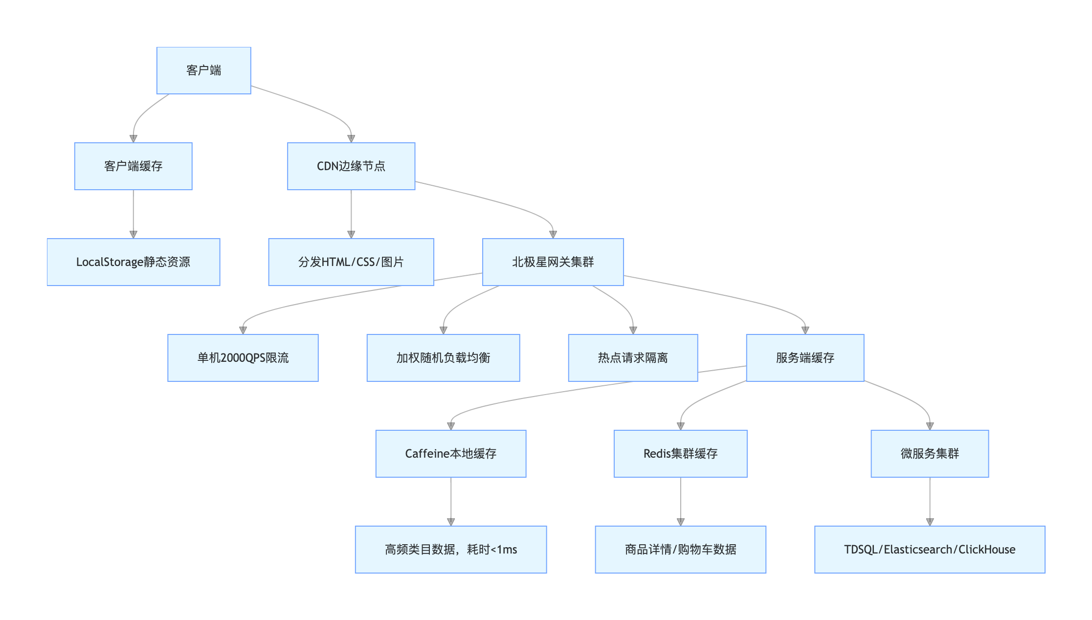 架构图说明:架构从 “客户端→CDN→网关→服务端” 构建四级缓存与流量治理体系。客户端与 CDN 拦截 80% 静态资源请求,减少源站压力;网关层实现限流、负载均衡与热点隔离,过滤无效流量并均匀分发请求;服务端通过本地缓存 + 分布式缓存,加速核心数据访问,最终实现全链路流量减压,支撑千万级并发。