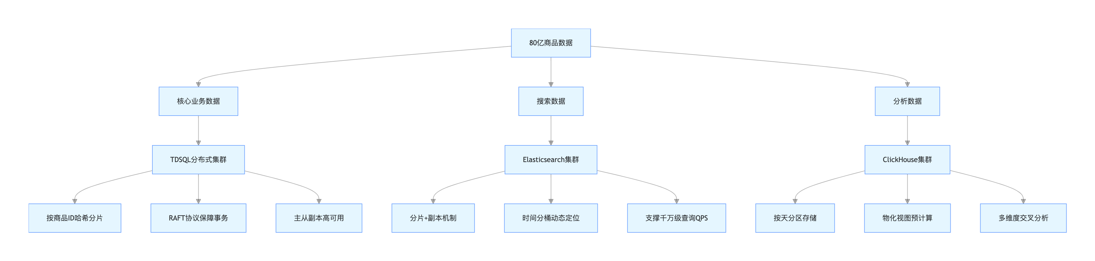 面对 80 亿条商品数据的存储需求,单一数据库无法支撑,需采用 “核心数据 + 搜索数据 + 分析数据” 的多引擎存储架构,形成互补协同的存储体系。