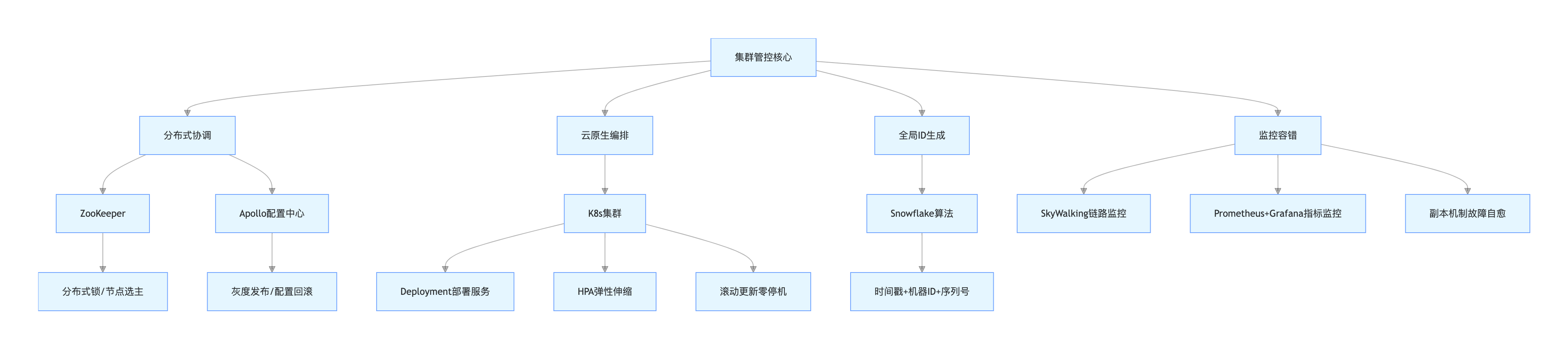架构图说明:该架构构建集群管控 “神经中枢”——ZooKeeper 保障分布式一致性,解决锁、选主等问题;Apollo 实现配置全局管控;K8s 负责服务部署、弹性伸缩与滚动更新,提升集群运维效率;Snowflake 算法生成全局唯一 ID,支撑亿级数据标识;监控容错体系实现链路追踪、指标告警与故障自愈,保障集群稳定运行。