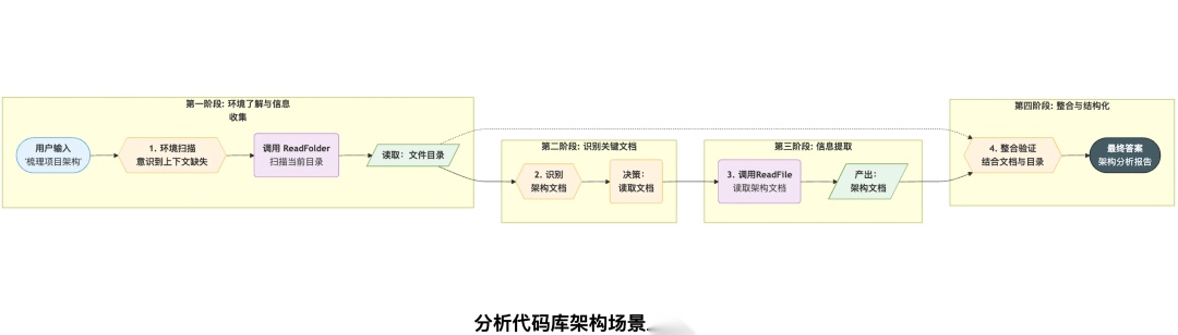 2.模式识别与策略制定: 在获取文件列表后,它利用内置的软件工程知识进行模式识别。当看到 docs/architecture.md 这个路径时,它迅速将用户的关键词“架构”与之关联,并制定出一条最高效的策略:优先读取官方文档,而非盲目分析代码。