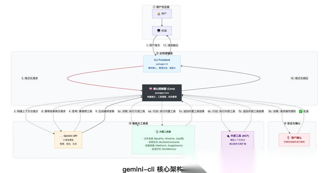 Google开源AI命令行工具gemini-cli,将大模型能力深度融入开发者工作流。该工具支持自动化系统任务、代码库分析和多模态开发,能通过自然语言指令完成文件处理、项目架构梳理和设计图转代码等复杂操作。其核心架构采用"推理-行动"循环机制,由cli层驱动任务流程,core层执行具体操作,实现智能规划、自我纠错和环境适应能力。通过工具调用、上下文管理和多轮交互,gemini-