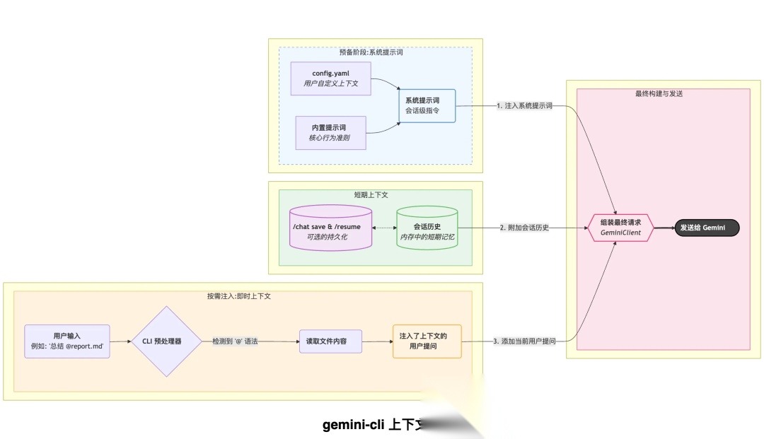 在前两节中,我们分析了 gemini-cli 的推理循环与工具执行能力。要让这些能力发挥最大价值,其管理和利用上下文的能力必不可少。gemini-cli 通过多层次上下文管理机制,实现了短期会话记忆、长期知识注入,确保了交互的连贯性。