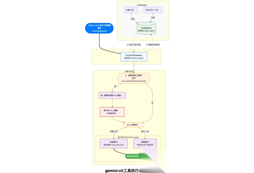 上一节我们看到,ReAct 循环的其中一个关键点在于模型能够决定何时调用工具。本节将深入探讨工具调用,以及 gemini-cli 是如何实现并安全执行它们的。整体逻辑可参考下图: