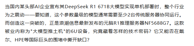 当国内某头部AI企业宣布其DeepSeek R1 671B大模型实现单机部署时,整个行业为之震动——要知道,这个参数量级的模型通常需要至少2台传统服务器协同运行。而创造这一突破的,正是浪潮信息最新发布的元脑R1推理服务器NF5688G7。这款被业内称为"大模型推土机"的6U设备,究竟藏着怎样的技术密码?它又能否在戴尔、HPE等国际巨头的围堵中撕开缺口?