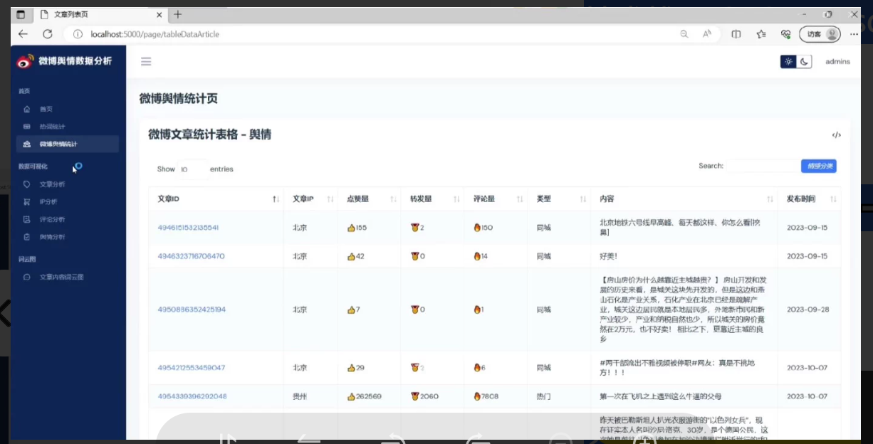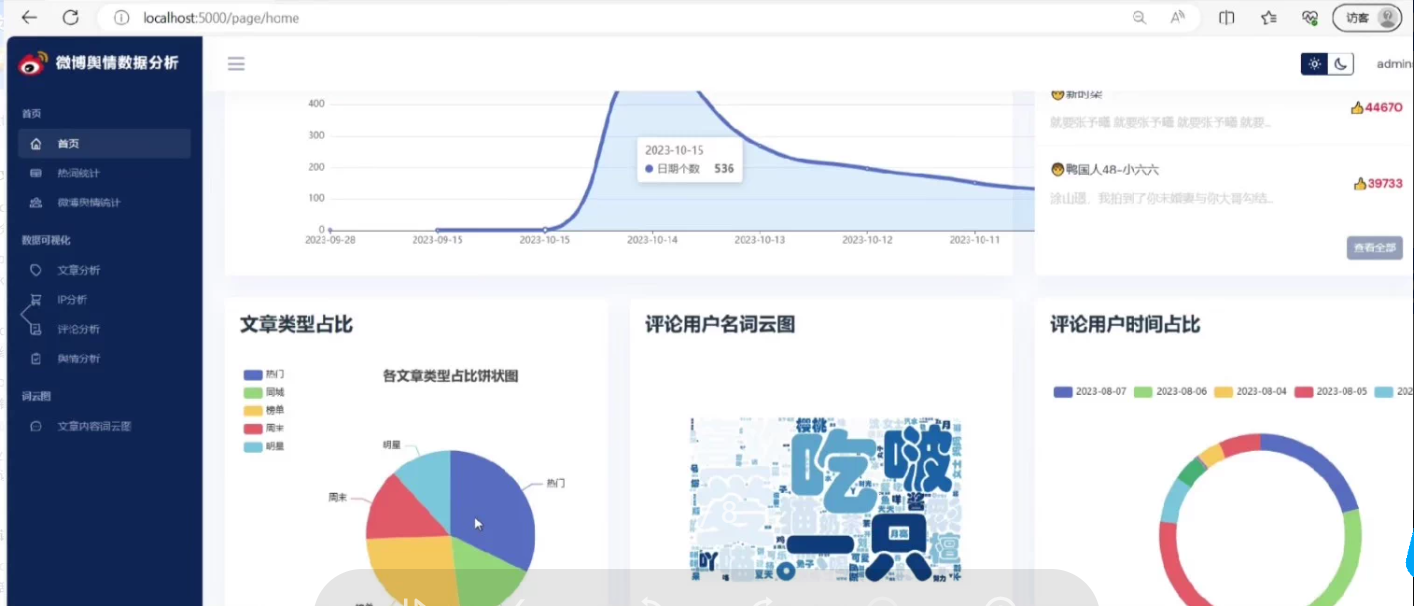 3. 可视化数据分析,包括文章分析、IP归属地分析、评论分析、舆情分析