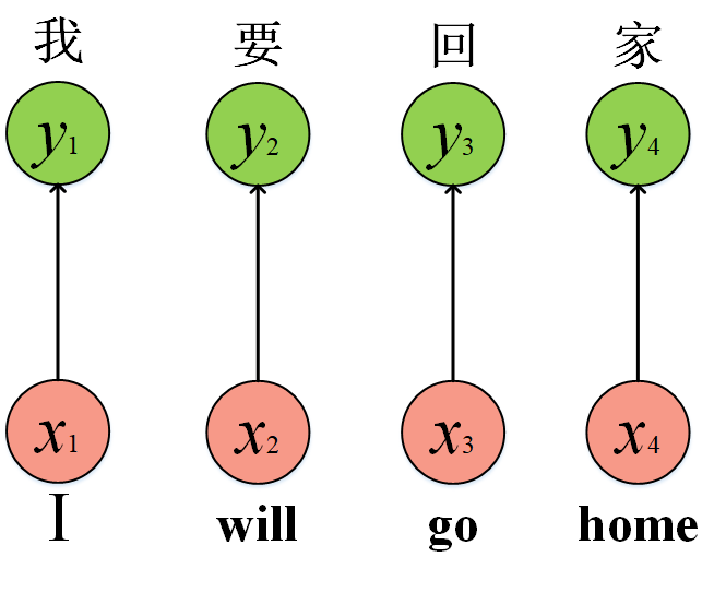 你很自然想到网络结构应该是这样的:输出和输出一一对应嘛,但是我们好像少考虑了些什么,正常来说,我们人类听到I will go几个单词后,极大概率猜测后面的单词是home,这是为什么呢?因为“回”往往是与“家”关联的,也就是说每个词与词之间包含着信息,然后我们下面的这种结构丢弃了这种关联性,网络很可能翻译成“我要回一”“我要回二”这种前前言不搭后语的句子。