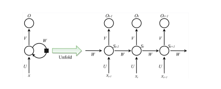 我们看下面市场上流通的RNN网络结构图,相信绝大部分人看到一开始看到RNN的网络结构图都会一脸懵逼,表示看不懂。这是啥?那个弯的箭头干啥用的?循环在哪儿?