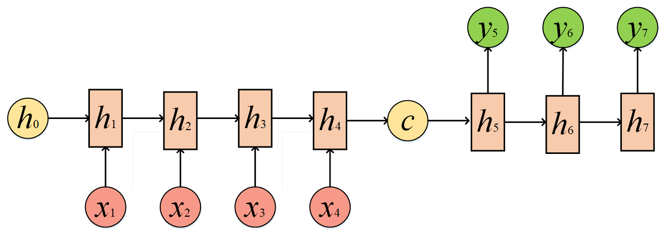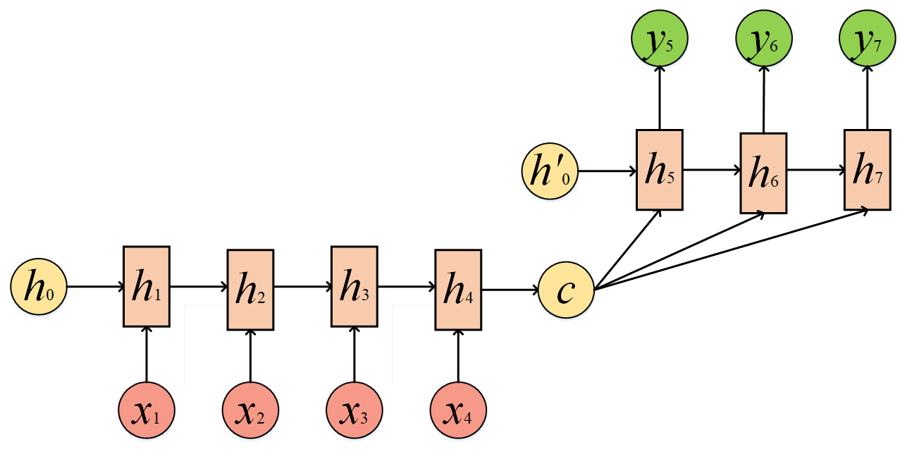 拿到c之后,就用另一个RNN网络对其进行解码,这部分RNN网络被称为Decoder。具体做法就是将c当做之前的初始状态h0输入到Decoder中: