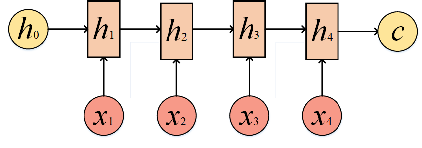 我们不去计算y1、y2和y3,只保留y4,这类问题通常为文本的情感分析,比如分析文本的情感是快乐还是伤感,本质上是一个分类问题,因此我们针对y4的结果其实是对h4进行一个softmax的输出: