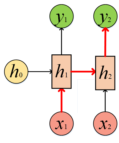 小伙伴们停下来多花几秒认真看下这个公式,是不是就理解了h2是怎么来的,y2是怎么来的。我们可以看出y2包含了h2的信息,而h2又是从h1计算来的,而h1又是从x1计算来的。这么一看,y2中就包含了x1的信息。
