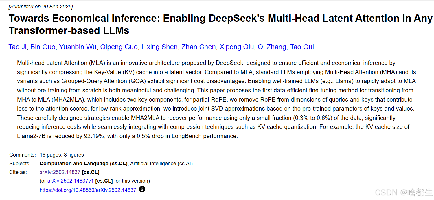 复旦大学、华东师范大学及上海AI Lab联合提出了一种名为MHA2MLA的数据高效微调方法,可将基于多头注意力(MHA)的大语言模型转换为多头潜在注意力(MLA)架构,显著降低推理成本。以Llama2-7B为例,该方法在减少92.19%的KV缓存大小的同时,仅使LongBench性能下降0.5%。此外,微调过程仅需0.3%~0.6%的原始数据,展现了高效性和兼容性