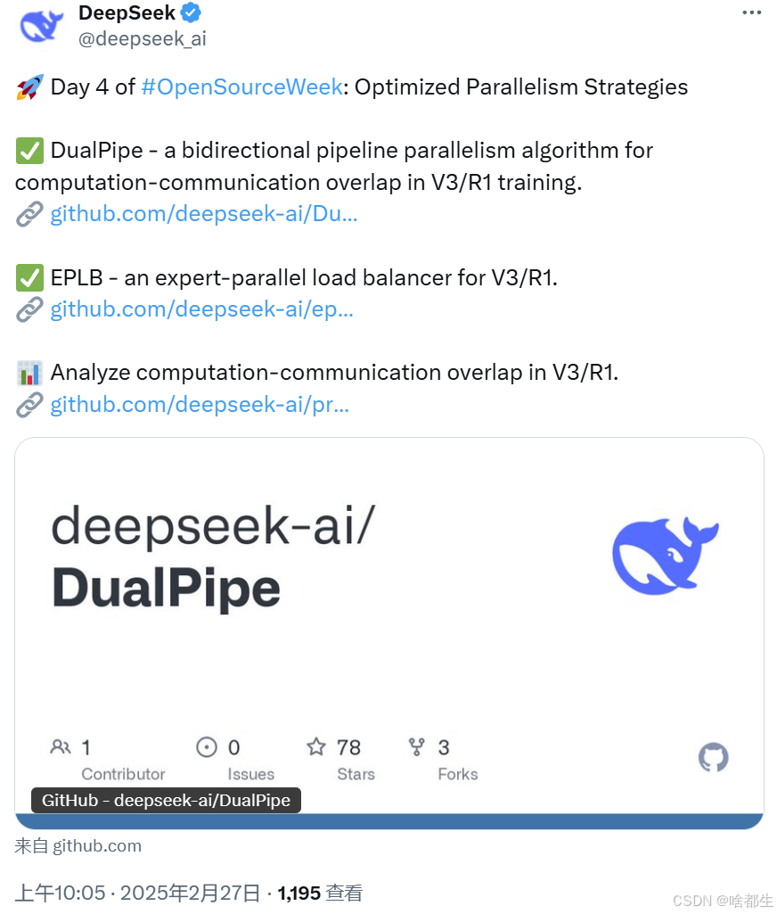DeepSeek在开源周第四天一口气发布了两项工具和一个数据集:DualPipe、EPLB以及训练和推理框架的分析数据。DualPipe是一种双向pipeline并行算法,可实现计算-通信重叠,减少流水线气泡;EPLB是专家并行负载均衡器,可智能分配专家负载,提高GPU利用率。此外,DeepSeek还公布了训练和推理框架的分析数据,帮助社区更好地理解通信计算重叠策略。同时,DeepSeek宣布API夜间错峰优惠,DeepSeek-V3和R1在夜间00:30至08:30的调用价格分别降至原价的50%和25%