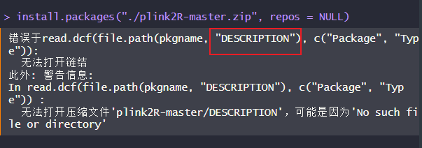 这是plink2R-master.zip中的文件内容,DESCRIPTION文件实际是在plink2R文件夹中,所以这个plink2R才是真正的安装包,将这个目录压缩然后再去R中本地安装。然后就是本地安装环节,但是本地安装报错了,没有DESCRIPTION这个文件,因为每个人写的R包中,文件夹都会有一个这个文件(还好之前写过一个,知道这个文件)。本地安装时,参数也一定要给对,因为这里边的type默