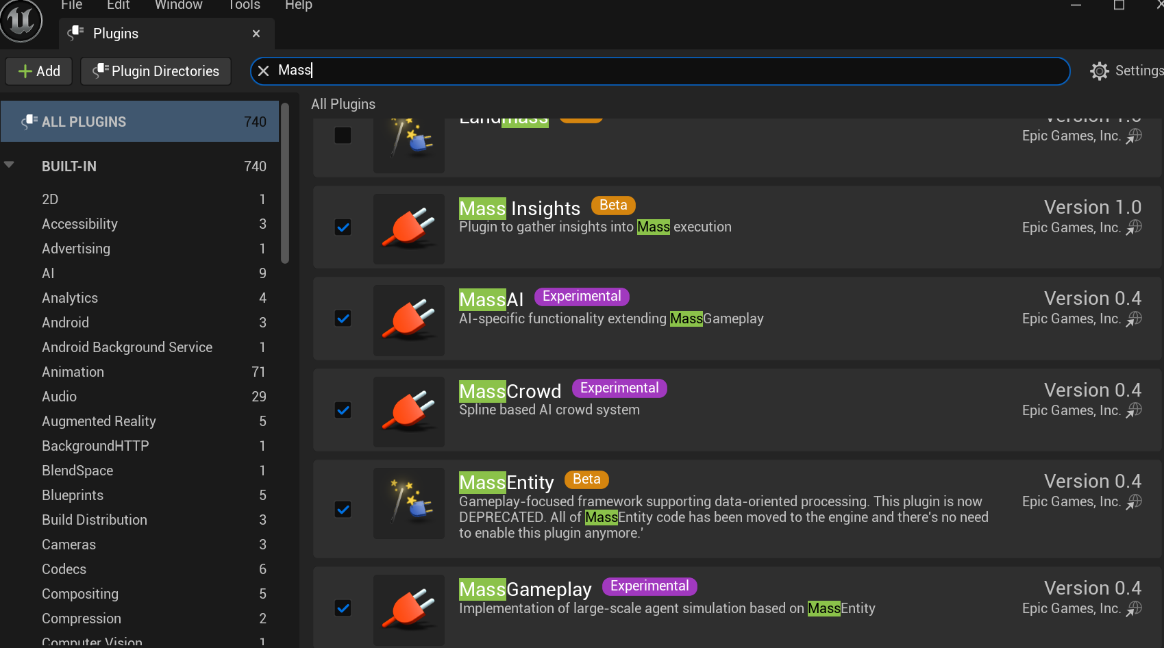 要想用MassAI,首先要启用MassAI的插件:然后重启编辑器