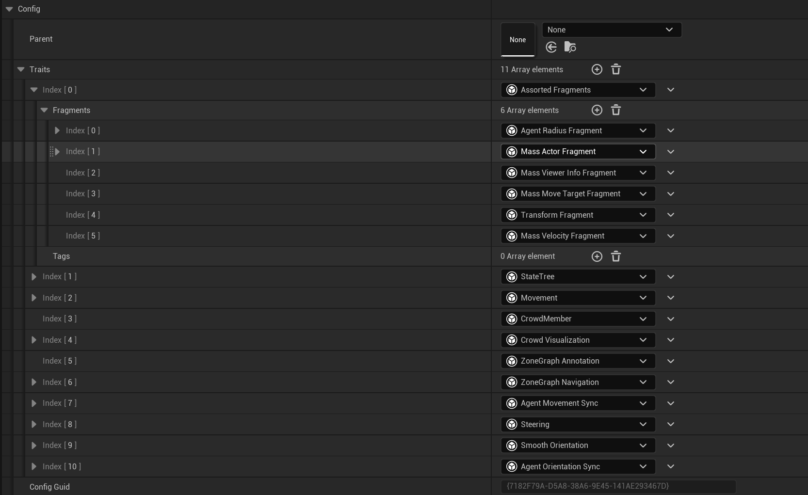 一切的起点,基于MassEntityConfigAsset,配置项,里面可配置一个Entity可以有哪些特征(trait),以及哪些片段(Fragment)。其中有的特征会依赖于片段,否则特征会不起效,特征也会尝试添加一些必要的片段给片段配置项里。