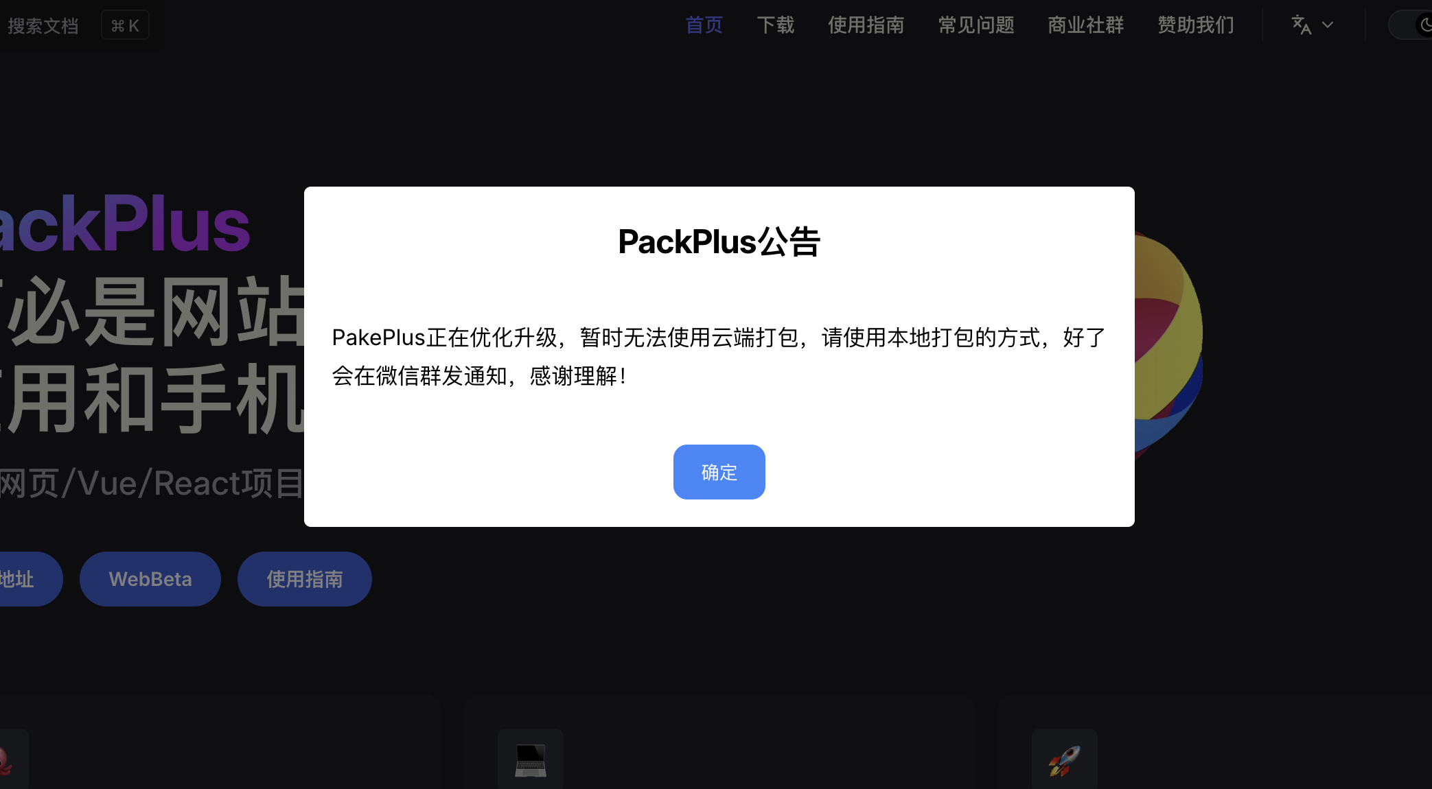 zh: 'PakePlus正在优化升级,暂时无法使用云端打包,请使用本地打包的方式,好了会在微信群发通知,感谢理解!',
