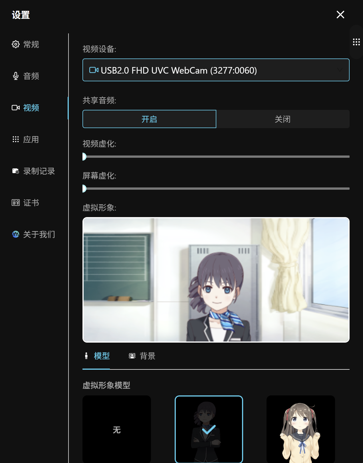 还可以设置摄像头模糊度和虚拟形象,不过没法自定义,有点难受。