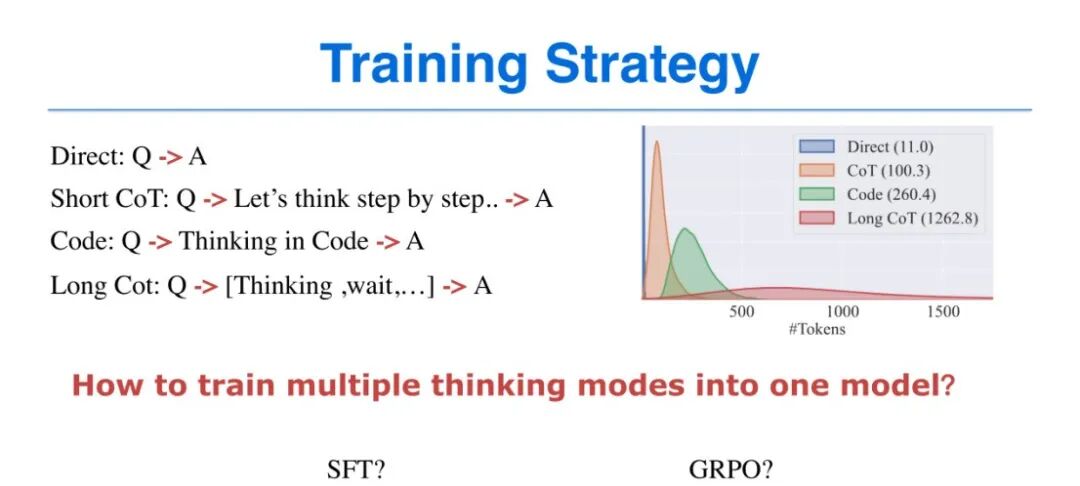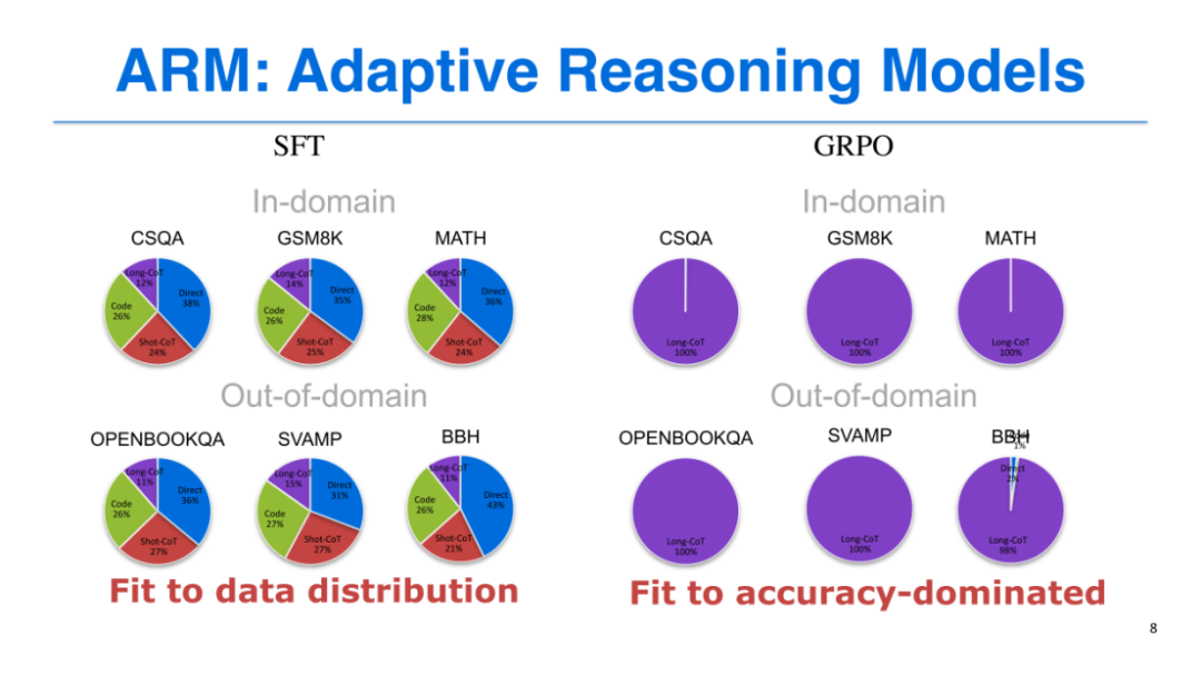 SFT的问题:SFT需将4种推理格式全部喂给模型训练,导致模型倾向于平均分配推理格式的使用概率,无法根据任务难度自主选择。例如,对于简单的常识问答(Common QA),模型未能更多采用高效的直接推理;对于复杂的数学任务,也未优先使用长链思维链推理,最终导致性能损失。