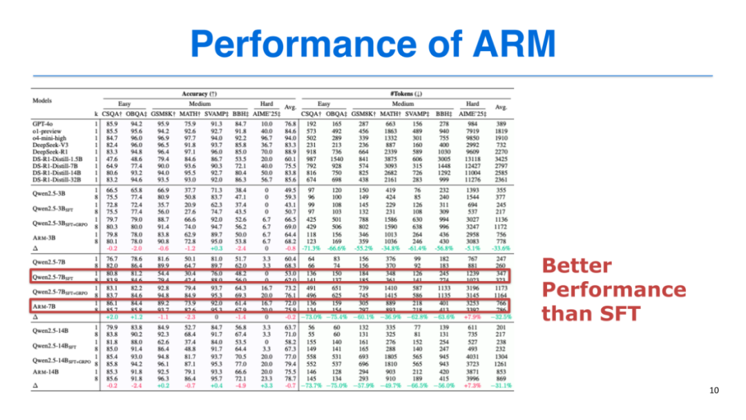 与SFT相比:ARM在所有模型规模(3B、7B、14B)上均实现性能提升,同时显著优化了token使用效率;