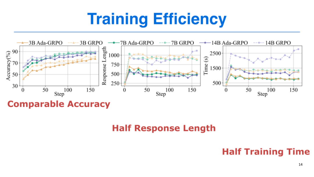 训练效率:与GRPO相比,ARM的响应长度缩短一半,训练时间节省近50%,因为训练时间主要受响应长度(token开销)影响;