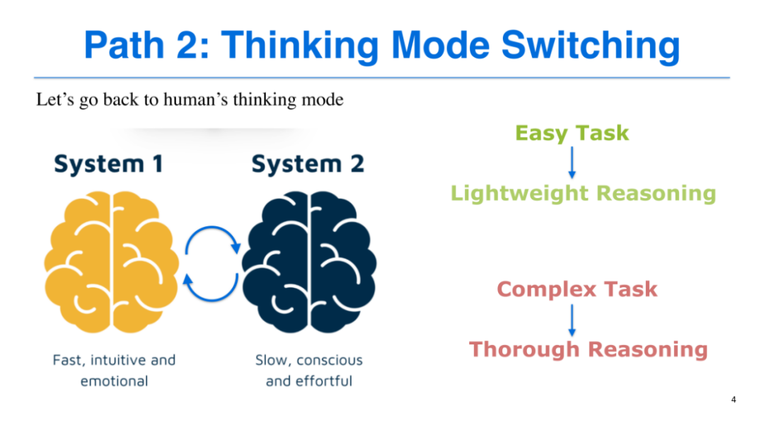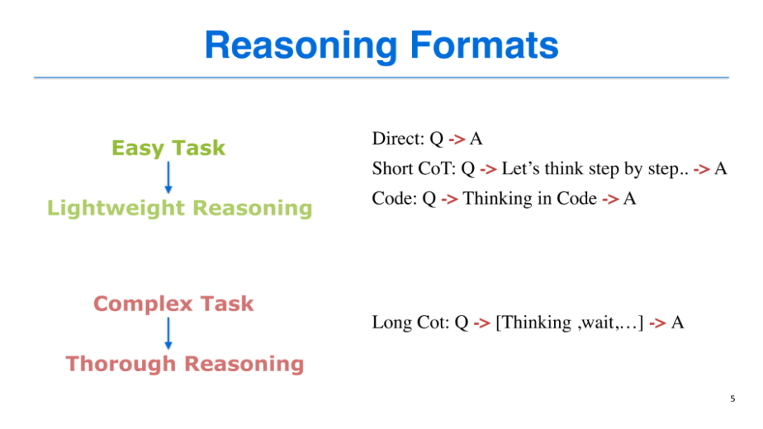我们的核心构想是:将这两种思维模式整合到同一个模型中,让模型能够根据任务难度自主选择合适的推理方式。人类已总结出多种可明确归类的推理格式,我们将其划分为“轻量化推理”和“深度推理”两大类,分别对应System 1和System 2: