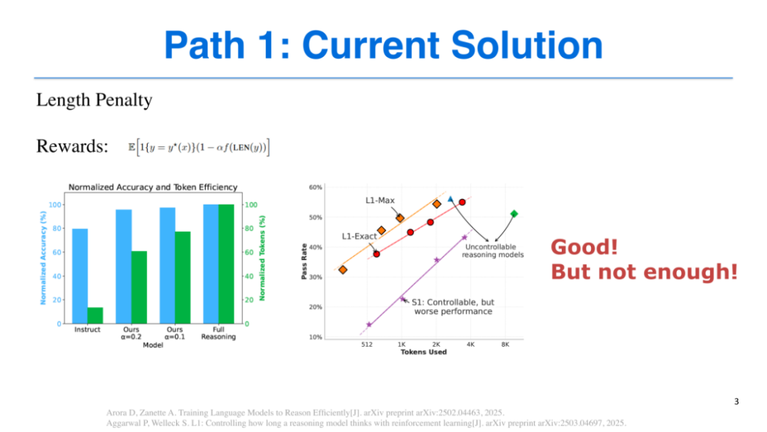 目前,学界已关注到“过度思考”问题并提出了相关解决方案,其中最具代表性的是“长度惩罚”(Length Penalty)方案,典型工作包括L1和ThinkPrune等。