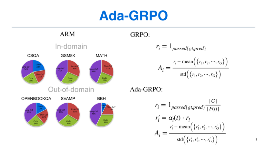 基础奖励与探索奖励结合:GRPO的奖励仅基于预测结果与真实标签的匹配度(0或1),而Ada-GRPO在此基础上,增加了“探索奖励权重”——对于在训练集中出现概率较低的推理格式(如Short CoT仅占2条,而Long CoT占6条),通过“组大小÷该格式样本数”的方式提升其奖励权重(如Short CoT的奖励为8÷2=4,Long CoT的奖励为8÷6≈1.3),鼓励模型探索高效但使用较少的推理格式。