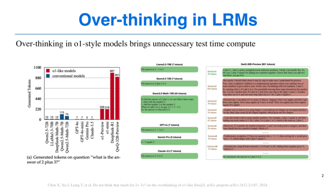 本项研究旨在解决大型语言模型(LRMs)中存在的“过度思考”(Over-thinking)问题。“过度思考”现象首次被提出并引发广泛关注,源于腾讯2024年的一项研究。该研究通过一个简单的示例——“2加3的结果是多少”,直观展现了这一问题:对于人类而言,“2加3等于5”是近乎常识性的知识,传统通用模型仅需几个或十几个token即可得出答案;但o1-preview、o1-mini、DeepSeek-R1、QWQ32等类o1模型,却需要消耗数百甚至近千个token才能完成这一简单计算。