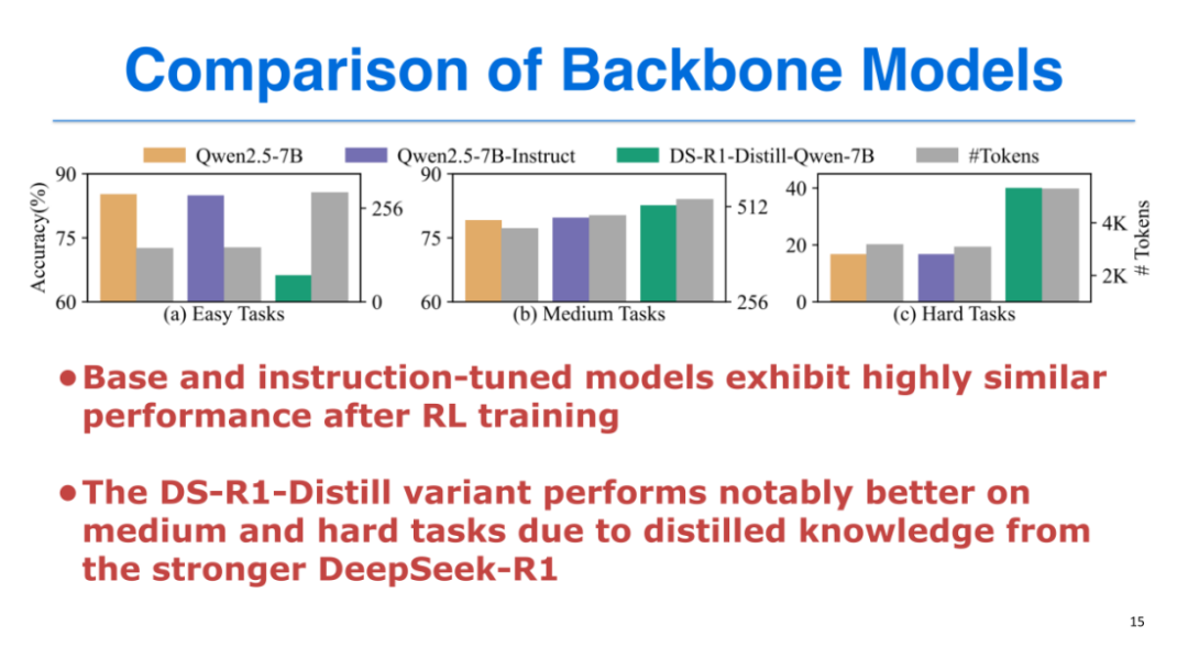 最终选择Qwen2.5-7B(Base)作为骨干模型,平衡了简单任务和复杂任务的表现。