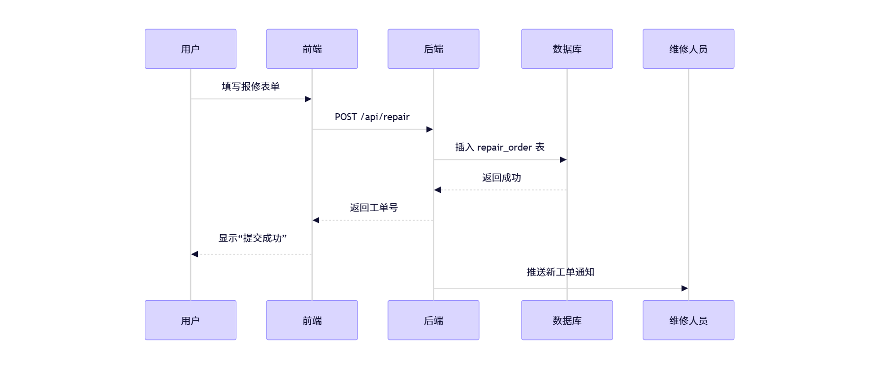 - 维修人员:接收工单、更新状态、上传凭证;