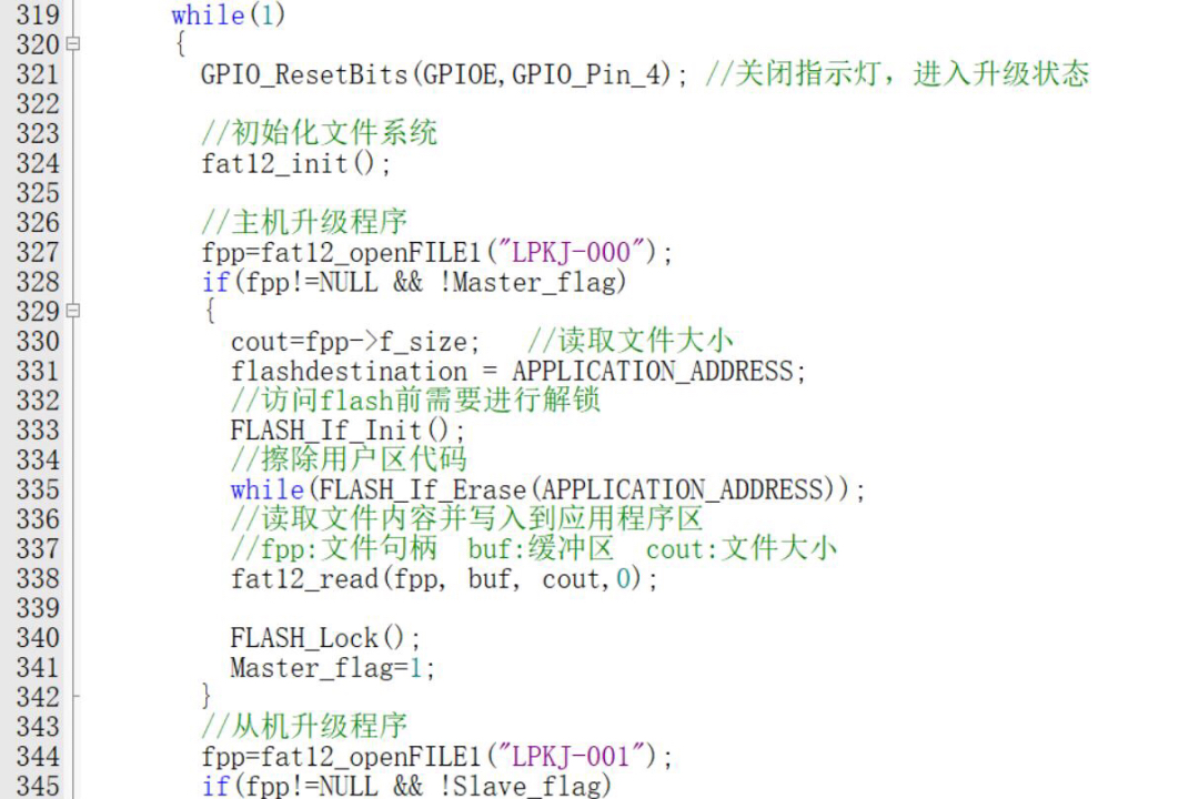 读取到固件包后,Bootloader需要将新程序写入Flash。以下是升级程序的代码示例: