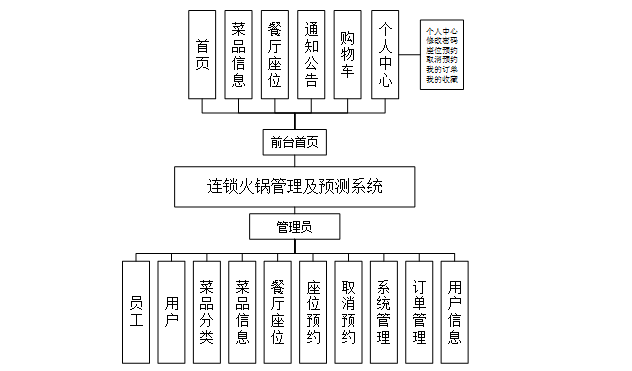 连锁火锅管理及预测系统综合网络空间开发设计要求。目的是通过网络平台将传统管理方式转换为在网上管理,完成连锁火锅管理的方便快捷、安全性高障,目标明确。连锁火锅管理及预测系统可以将功能划分为管理员使用的功能、员工功能和用户使用的功能。