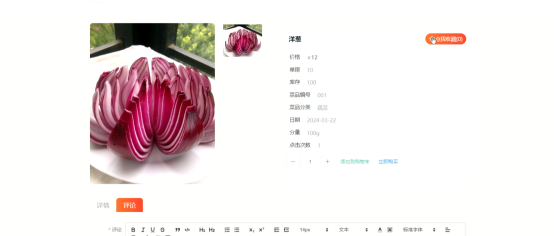 菜品信息(编号、名称、分类、封面、价格、分量、库存、单限、详情、评论、收藏、点击量)