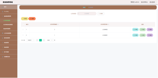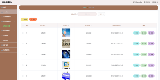 如图显示的就是美食列表页面,此页面提供给管理员的功能有:查看美食、新增美食、修改美食、删除美食等。
