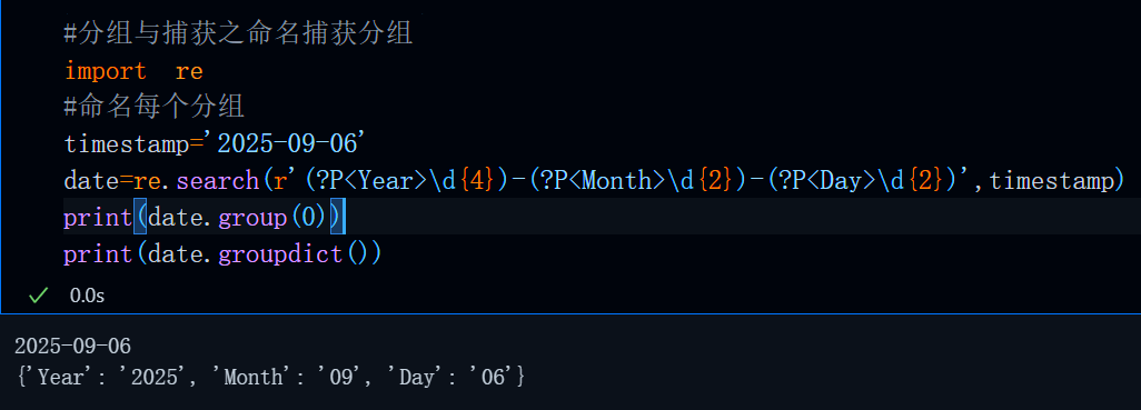也就是在分组括号最前端使用?P<>来对该分组命名,命名后,我们可以使用group('name')来分别获取每一个分组内容(group(0)依然是完整匹配结果),此时称这些分组为捕获组,可以使用groupdict()方法来获取具体的分组情况: