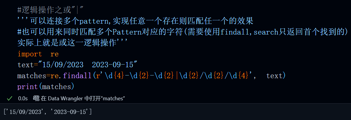正则表达式支持“或”这一逻辑操作,'|'可以连接多个pattern,实现任意一个存在则匹配的效果,当然也可以用来同时匹配多个Pattern对应的字符(需要使用findall,search只返回首个找到的)