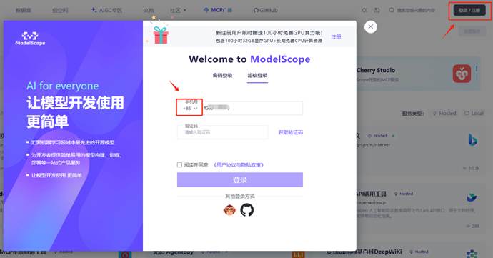 - Step 2. 点击右上角登录按钮,登录ModelScope账号