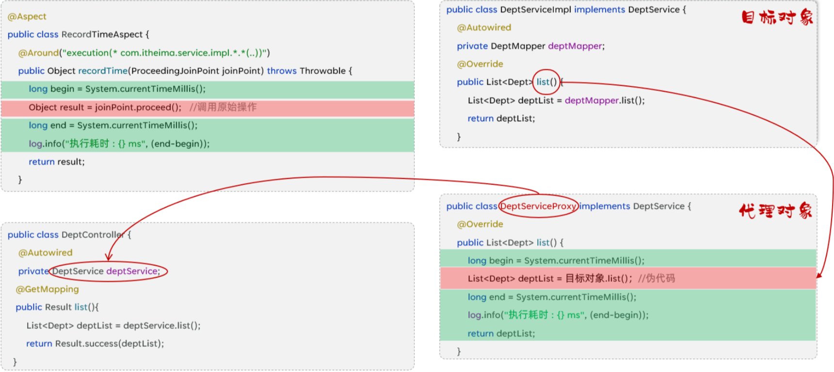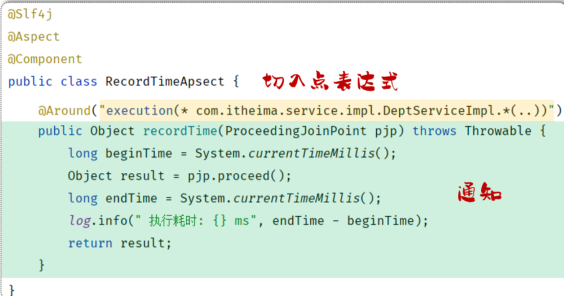 但是这样代码就显得十分繁琐重复,而这个功能如果通过AOP来实现,我们只需要单独定义下面这一小段代码即可,不需要修改原始的任何业务方法即可记录每一个业务方法的执行耗时。