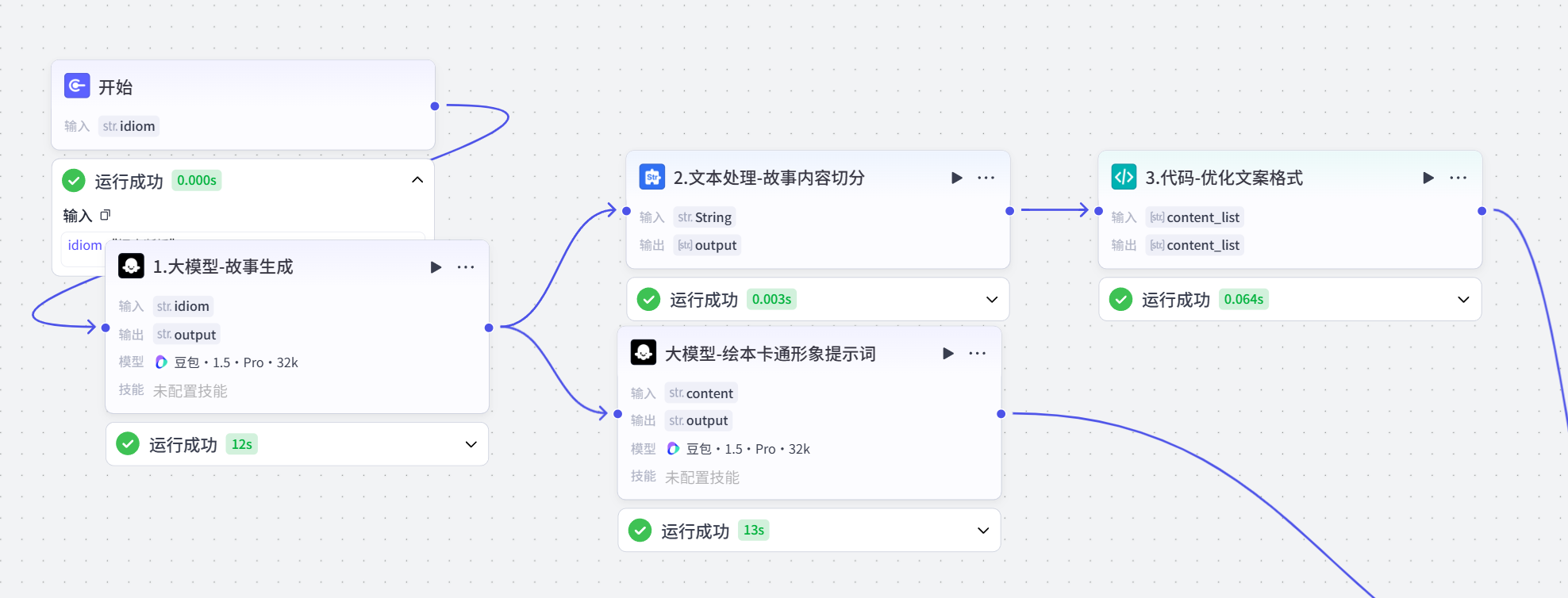 - 功能描述:用于把大模型生成的成语故事按段落拆分,输出成多个小段落