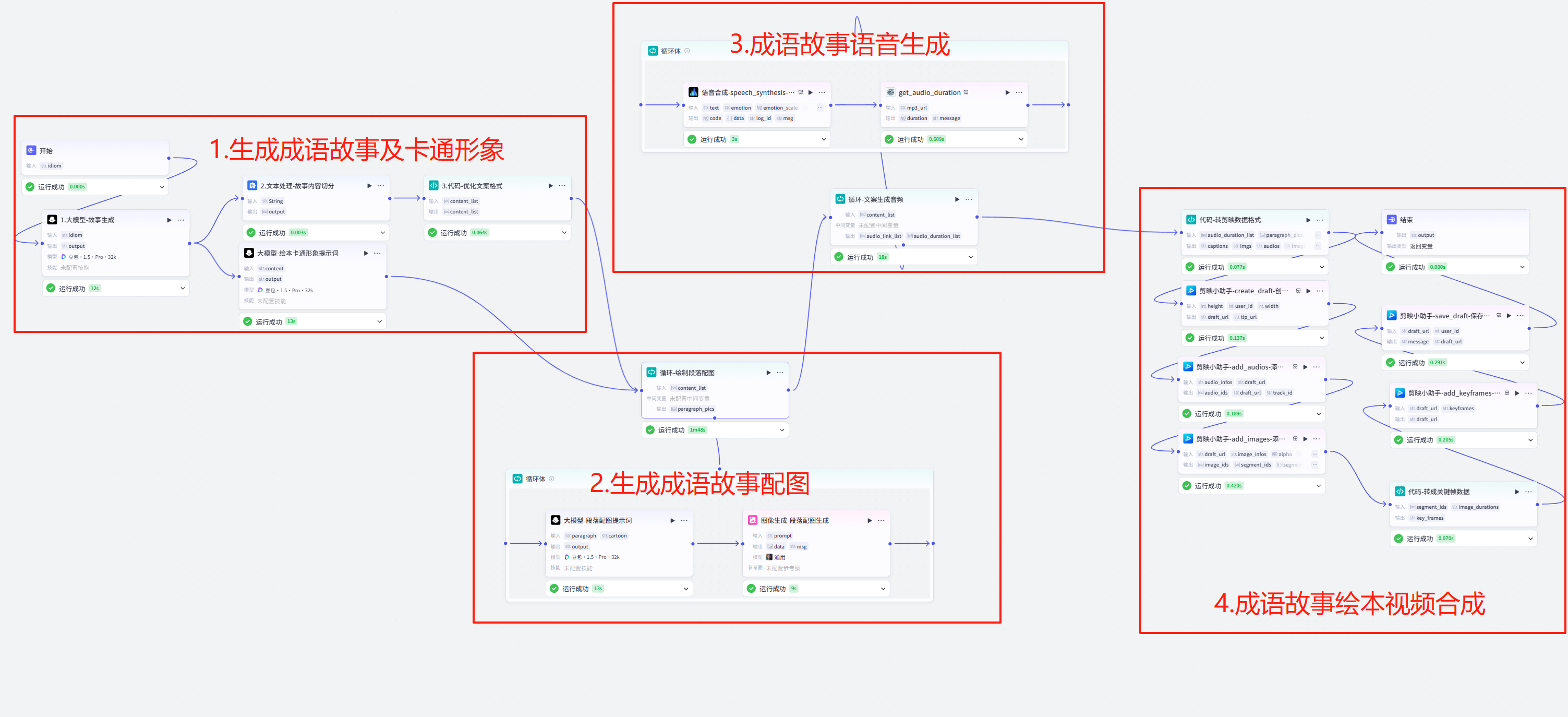 这个工作流不算复杂,文章下方我会按照【生成成语故事及卡通形象】、【生成成语故事配图】、【成语故事语音生成】和【成语故事绘本视频合成】四部分做讲解。这个工作流使用到的提示词、代码以及工作流的源码我都统一打包好放到了文末。