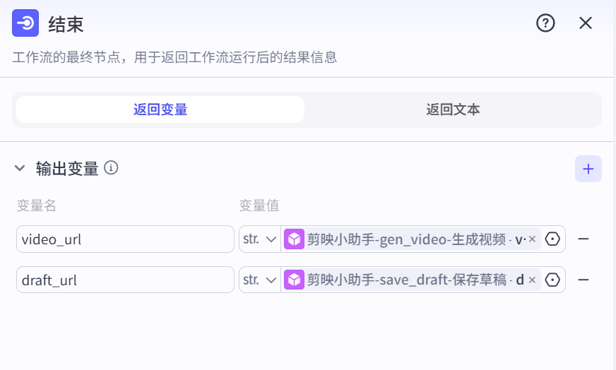 - draft_url:剪映草稿地址,可下载导入剪映做二次剪辑,引用“剪映小助手-save_draft-保存草稿”输出的“draft_url”