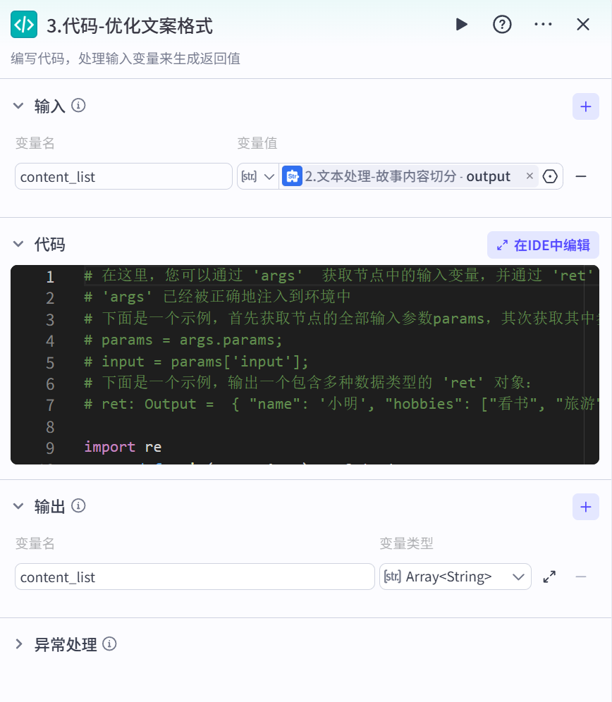 - content_list:故事段落列表,引用“3.代码-优化文案格式”输出的“content_list”
