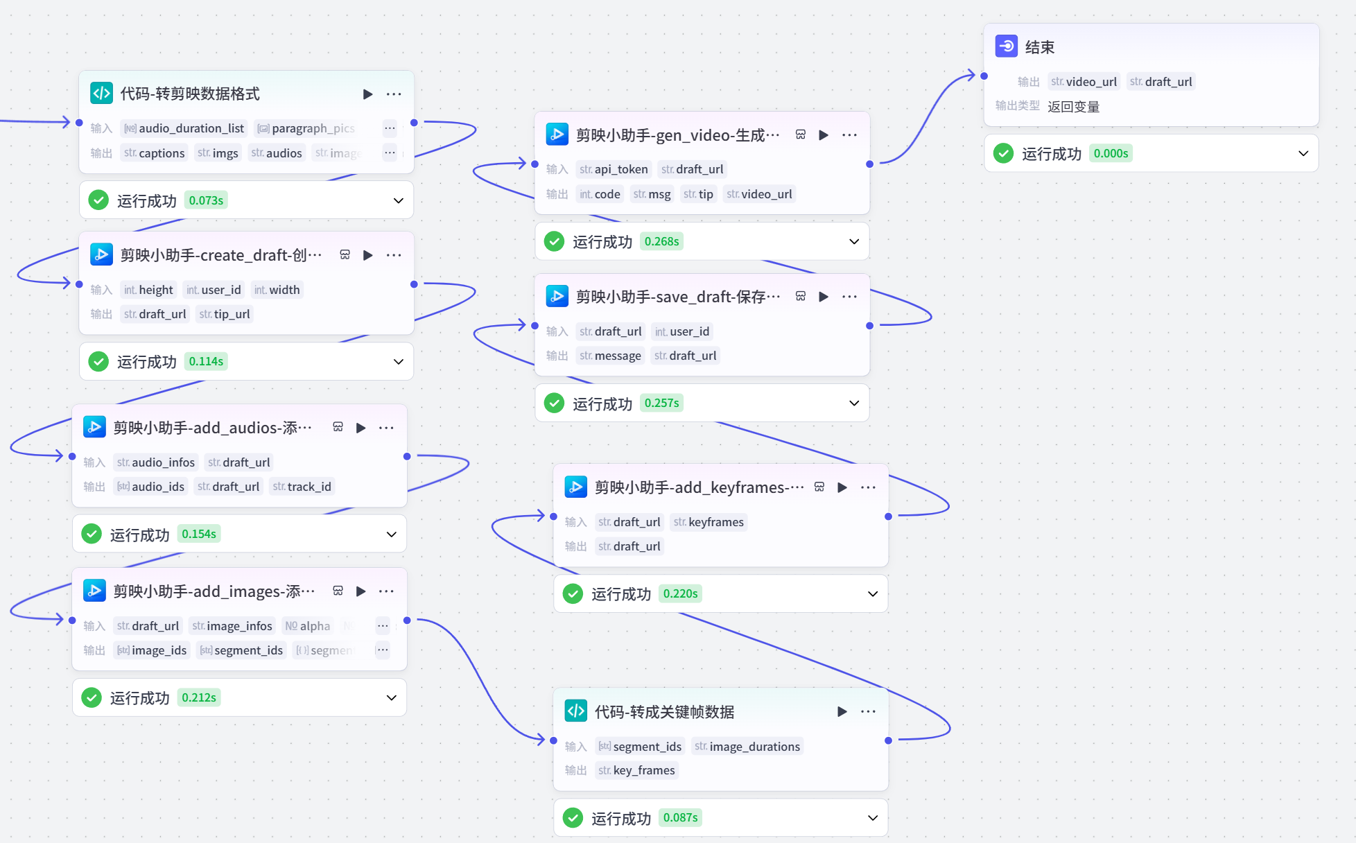 这一部分用于把前面生成的故事音频、故事配图、文案等,添加到剪映草稿的轨道中,生成剪影的草稿。这部分节点主要使用到了“视频合成_剪映小助手”插件下面的一些工具。主要的流程就是先创建一个剪映得草稿,往草稿中添加语音、添加图片、添加关键帧等,最后生成剪映草稿和视频。需要微调的可以下载剪映草稿,导入剪映做二次剪辑,不需要的可以直接使用生成的视频地址下载视频。