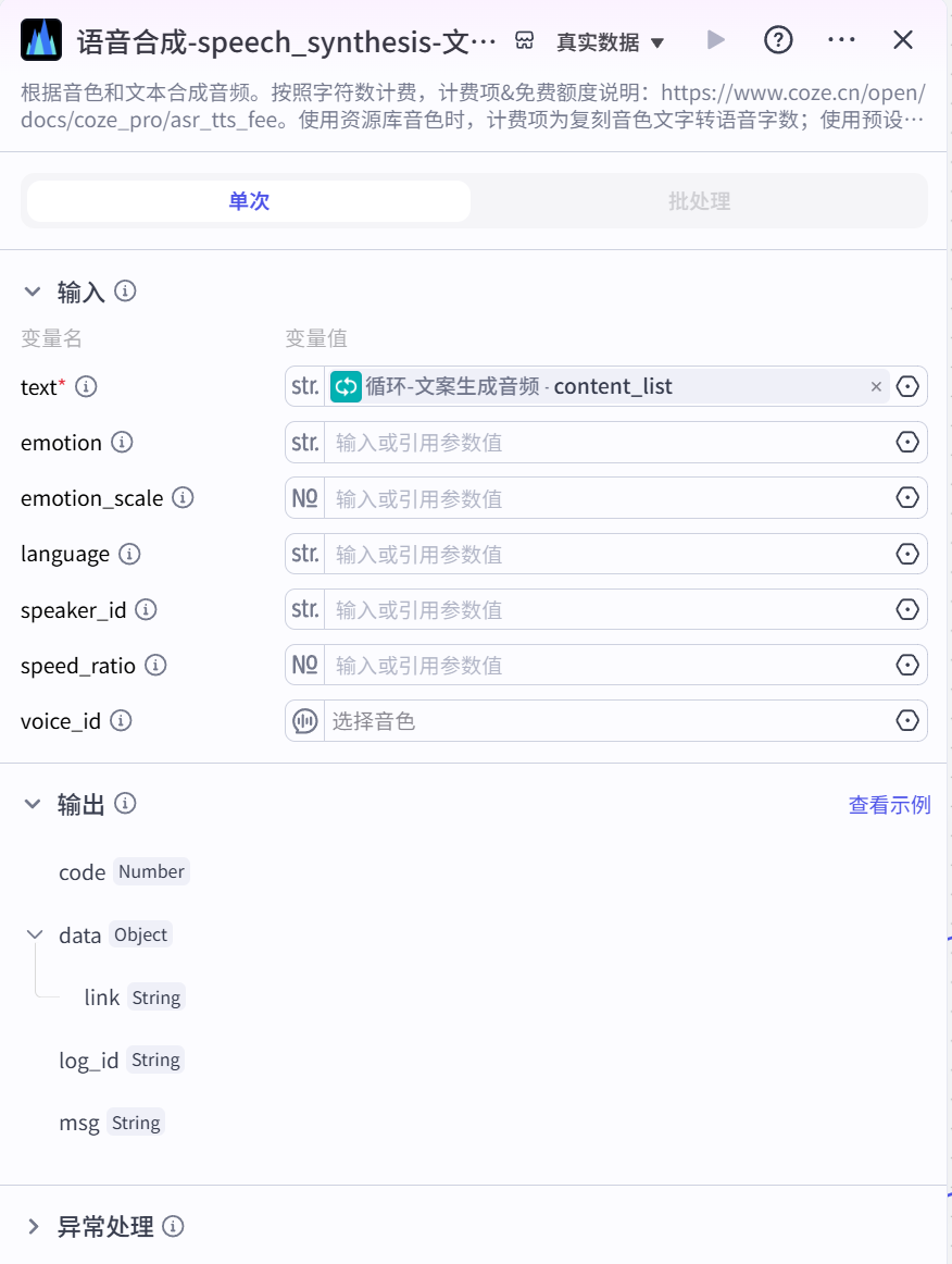 - 功能描述:这个节点是用到了“语音合成”插件的“speech_synthesis”工具,用于把文案转成语音