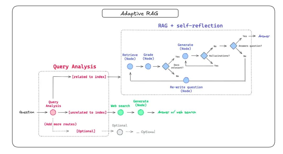 以下是来自 LangGraph 的自适应 RAG 系统架构流程示例: