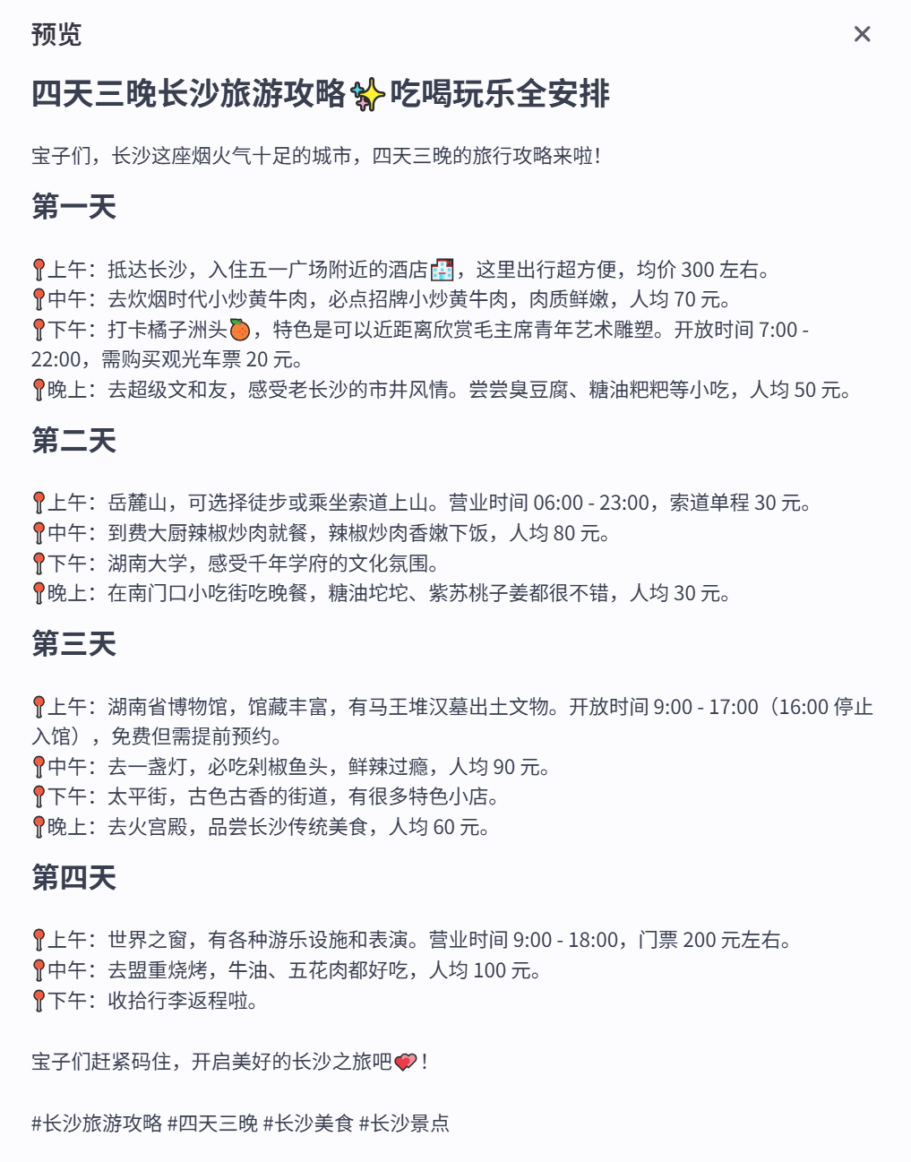 - 旅行目的地:长沙