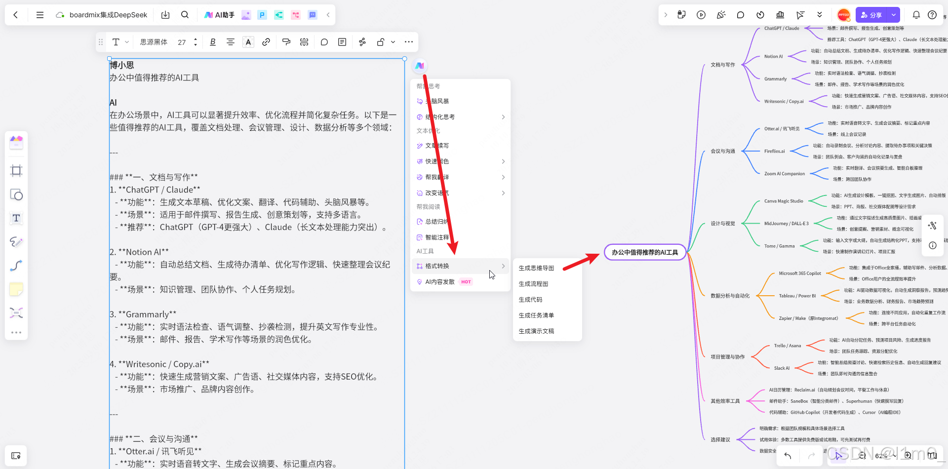 选中boardmix画布上DeepSeek生成的内容,点击右侧的boardmix AI助手图标,选择“格式转换 > 生成思维导图”,可一键将DeepSeek内容转换为最右侧的思维导图。