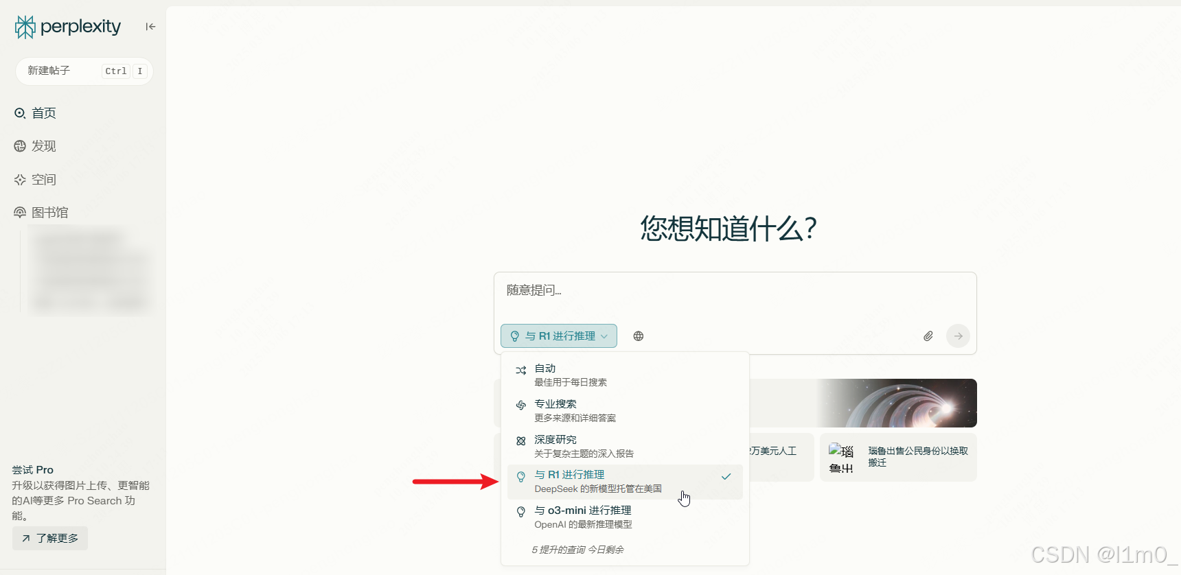 如今Perplexity也在产品内部署DeepSeek R1模型,点击输入框左下角的选项,切换为“与R1进行推理”,就能在Perplexity中使用DeepSeek。